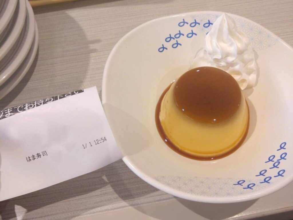 はま寿司で大好きな「たまごプリン」に手を合わせる元日。